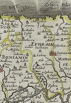 Bethel was allocated by Joshua to the Tribe of Benjamin.[22] However, even by the time of the prophetess Deborah, Bethel is described as being in the land of the Tribe of Ephraim.[23] Some twenty years after the breakup of the United Monarchy, Abijah, the second king of Kingdom of Judah, defeated Jeroboam of Israel and took back the towns of Bethel, Jeshanah and Ephron, with their surrounding villages.[24] Ephron is believed to be the Ophrah that was also allocated to the Tribe of Benjamin by Joshua.[25]