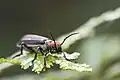 The adults of E. waterhousei, which emerge between April and July,[1] are recognisable by their dull black elytra with a greyish longitudinal stripe, extending from humeral angle towards apex of elytron, and orange-red head does not have black dorsal markings. Similar species include E. erythrocephala, the type and E. gorhami from Honshu, Japan.