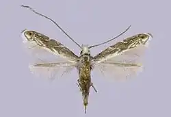 The wingspan is 7.2–8.8 mm. The forewings are brown with a narrow white band on the dorsum from the base to 2/3 of the entire length and with two pairs of narrow white bands beginning at the costal and dorsal margin near 1/2 to 3/4 length of the wing and extending obliquely toward the wing apex, terminating before reaching mid-width of the wing. The dorso-distal band is accompanied by another parallel band of same size on the distal position and there is a narrow silver band with metallic reflection extending from the costa to the dorsum at 5/6 length. The distal 1/6 is orange-brown with a black dot centrally, franked by short white band near the dorsum. The distal end is fringed with a narrow white band. The hindwings are brown.