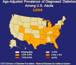 - ^ Mokdad A, Ford E, Bowman B, Nelson D, Engelgau M, Vinicor F, Marks J (2000). "Diabetes trends in the U.S.: 1990-1998". Diabetes Care. 23 (9): 1278–1283. doi:10.2337/diacare.23.9.1278. PMID 10977060.