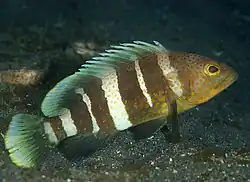 The yellow grouper (Epinephelus awoara), also known as the banded grouper, is a species of marine ray-finned fish, a grouper from the subfamily Epinephelinae which is part of the family Serranidae, which also includes the anthias and sea basses. It is found in eastern Asian waters of the Western Pacific Ocean. Its natural habitats are shallow seas and rocky reefs.