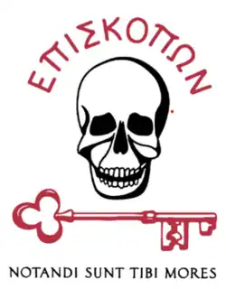 The name Episkopon is Greek for "Bishop".[3] The society's mythological premise was to deliver "gentle chastisement" on behalf of the Venerable Father (or Mother) Episkopon, a spirit who supposedly resided at Trinity and was represented at readings by a human skull.[5] The motto of the organization is from Horace: Notandi Sunt Tibi Mores (Latin: "The manners of men are to be carefully observed").