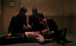 Inside the interrogation room, BOB confesses through Leland's body that he murdered Theresa Banks, Laura Palmer and Maddy Ferguson. When Cooper, Albert, Sheriff Truman and Hawk leave, BOB chants a poem ending with the phrase "fire, walk with me."[7] The water sprinklers turn on, triggered by smoke from Dick Tremayne's cigarette, and BOB forces Leland to commit suicide by ramming his head into the door. BOB vacates Leland's body, and Leland becomes aware of what BOB did while in his body and reveals the nature of his possession as he dies. Cooper comforts Leland through his last moments by reciting a paraphrase of a passage from the Bardo Thodol,[8] and Leland dies after seeing a vision of Laura.