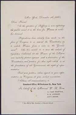 The women's movement was loosely structured during this period, with legislative campaigns and speaking tours organized by a small group of women acting on personal initiative. An informal coordinating committee organized national women's rights conventions, but there were only a few state associations and no formal national organization.[13] The movement largely disappeared from public notice during the Civil War (1861–1865) as women's rights activists focused their energy on the campaign against slavery. In 1863 Elizabeth Cady Stanton and Susan B. Anthony organized the Women's Loyal National League, the first national women's political organization in the U.S., to campaign for an amendment to the U.S. Constitution that would abolish slavery.[14][15]