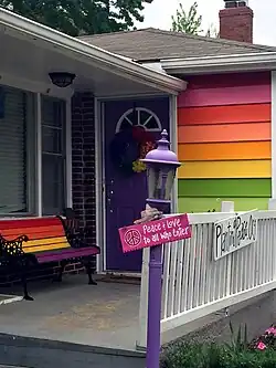 The Equality House is a rainbow-colored house in Topeka, Kansas that is situated on the corner of 12th and Orleans Street, across from Westboro Baptist Church, an anti-LGBT hate group. The property was purchased by Aaron Jackson, the founder of the nonprofit organization Planting Peace, after he saw a "for sale" sign on a nearby house when looking at the community on Google Earth.[1] He had the house painted in the colors of the rainbow flag to show support for LGBT rights.