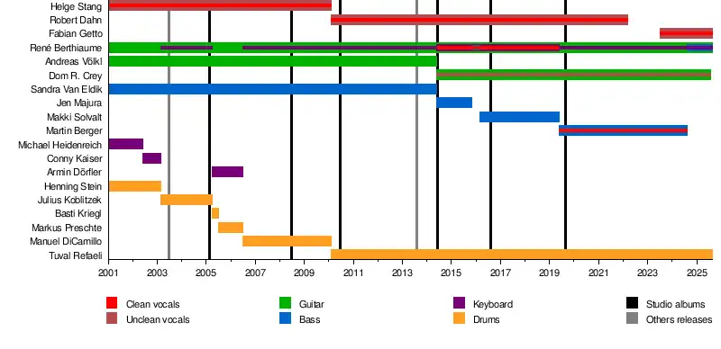 - Helge Stang − unclean and clean vocals (2001–2010)
