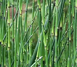 It is one of the largest horsetails, growing 2–5 metres (6.6–16.4 ft) tall, exceeded only by the closely allied Equisetum myriochaetum (up to 8 metres (26 ft) relying on surrounding plants' support. One form or variety has reached a height of 11 m (36 ft) in Venezuela,[3] and a height of 12 m (39 ft) in the Pantanal region of Brazil.[4] The stems are the stoutest of any horsetail, 1–2 cm diameter, up to 3.5 cm in diameter in some populations),[5] and bear numerous whorls of very slender branches; as many as 56 scale-like leaves in a whorl[6] although it is unclear whether all of these would produce branches. These branches are not further branched, but some terminate in spore cones. Unlike some other horsetails, it does not have separate photosynthetic sterile and non-photosynthetic spore-bearing stems.