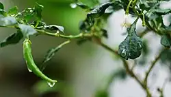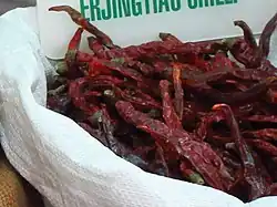 Er jing tiao (simplified Chinese: 二荆条; traditional Chinese: 二荊條; pinyin: Èr jīngtiáo) is a variety of chili that is most common in Sichuan cuisine of China. The chili is typically shaped like the letter J and is between 5 and 6 inches long. This chili is known for its deep color and robust fragrance, and is often used in chili oil for that reason. It is also a major ingredient for many famous chili sauce products, such as the thick broad-bean sauce doubanjiang. It has a spicy and salty flavor which is used in combination with noodles or rice. It has a long history in Chinese cuisine and has gained popularity over time. It is easy to find in traditional authentic Sichuan cuisine, whether in a restaurant or home kitchens. Er jing tiao's taste is different from common types of chili; its taste and smell are slightly spicier. Its colors change from green to red as time passes. They are also eaten as a fresh vegetable seasoned with salt and soy sauce as well as preserved as a salted and (lacto-)fermented chili condiment known as duo jiao (duò jiāo 剁椒, lit. 'chopped chili'). Harvesting time is usually from early May to October.