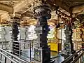 The architectural style of the temple is close to Ramappa temple and Kota Gullu, other Kakatiya era temples. The temple is placed on an upapitha and is cruciform in shape.[14][15] It has three porticos in the east, north and south and a garbhalaya in the west. The sikhara on the inner sanctum (garbhagudi) is made of brick and lime and is decorated all over by miniature turrets. It is said that the stone used in temple construction has interesting acoustic properties. When the temple stone is tapped with a coin, it sounds like metal.[15] The temple has intricately carved pillars and walls. The temple walls are painted with frescoes.