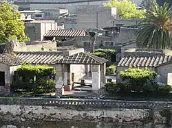 The Archeological site of Herculaneum (in Italian: Scavi di Ercolano) is the area south of the town centre of modern Ercolano where the Roman town of Herculaneum has been excavated. Herculaneum was destroyed and buried by lava and mud during the eruption of Mt. Vesuvius in AD 79 together with Pompeii, Stabiae and Oplontis. In 1997 the Herculaneum site was listed as a World Heritage Site by UNESCO. Although Herculaneum was discovered before Pompeii, the excavation was so difficult that it was repeatedly interrupted in favour of the easier excavation of Pompeii. Herculaneum is smaller and less famous than Pompeii, but better preserved due to the different volcanic materials that covered the town. In Herculaneum there are many wooden remains (doors, furniture, beams) and organic goods (fruit, bread, seeds, rope) that were burnt in Pompeii. Many Herculaneum buildings still retain their upper floors either entirely or in part. The excavated area of Herculaneum consists of only one quarter of the entire ancient town because the rest of the site still lies beneath modern Ercolano.