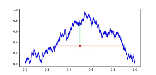 A Brownian excursion . Here, the process has a single point, marked with a red dot. The red line corresponds to a single internal node of the associated tree , the green line corresponds to a leaf of . If one adds an edge between the two nodes, one obtains a graph with a single cycle.
