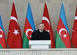 On 10 December 2020, Turkish president Recep Tayyip Erdoğan was attending the Baku Victory Parade in the Republic of Azerbaijan. There, he read parts of a controversial poem, which, tapping into themes of Azerbaijani irredentism and pan-Turkism, subtly suggested a territorial affinity between Iranian Azerbaijan and the Republic of Azerbaijan. The incident sparked tensions with Iran; the Iranian government denounced Erdoğan's remarks as an act of challenging Iran's sovereignty, and a number of Iranian citizens protested at Turkish diplomatic missions in their country.[1][2]