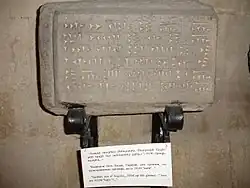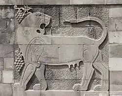 A cuneiform inscription testifies that the city was built by Argishti I the King of Urartu in 782 BCE. The majority of the fortress was built from raw bricks. The citadel was encircled by strong walls in some places built in three rows. The temple of God Khaldi occupied an important place in the fortress. The walls of the temple were decorated with numerous frescos. Archeologists have found giant karasses (pitches for storage of wine) buried in the ground. Ceramics, potter's wheels and other articles used in everyday life were also unearthed during excavations. There is huge collection of artifacts, sups, jars, bronze bracelets, glass, agate beads and many other things that tell us about the life of the citadel, the tastes and habits of its inhabitants. The building of the Museum that houses 12,235 exhibits was constructed by architects Baghdasar Arzoumanian and Shmavon Azatian and sculptor A. Harutiunian. It has two branches in Shengavit and Karmir Blur with 5,288 and 1,620 exhibits respectively in stock.[2] The sculptural design of the museum is the history of the ancient state of Urartu, represented by plastic means of expression. For sculpture of Erebuni Museum in 1970 Ara Harutyunyan was awarded a diploma of the USSR Union of Architects for the sculptures on the museum building.[3]