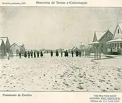 In 1908, the Erechim Colony was founded, planned by the Director of Lands and Colonization, Carlos Torres Gonçalves, following positivist principles to serve as a model for colonization.[17] The colony experienced rapid economic growth, facilitated by the presence of a railway and well-planned roads constructed according to the colony’s original design.[17] The colony was officially established in 1910 with the arrival of the first 36 settlers: four families totaling 28 individuals and four single persons.[17]