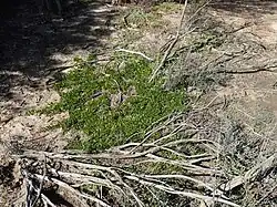 Eremophila serpens is a prostrate shrub which often has long, snake-like branches which have short side-branches. It forms patches 3 to 4 cm (1 to 2 in) high and up to 2.5 m (8 ft) wide. The branches are glabrous and contact the ground along most of their length, often forming roots. The leaves are arranged alternately along the branches and are lance-shaped, often have small, irregular serrations, and are mostly 31–47 mm (1–2 in) long and 8–12 mm (0.3–0.5 in) wide.[2][3][4][5]