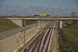 The design speed is largely 300 km/h (186 mph), reduced to 160 km/h (100 mph) on the branch to Halle.[8] 15.4 km (9.6 mi) of the 123 km (76 mi)-long high-speed line is located in three tunnels; the six viaducts of the route together are more than 14.4 km (8.9 mi) long.[9] With a length of approximately 6,465 metres (21,211 ft), the Saale-Elster Viaduct is the longest bridge structure in Germany and the longest bridge on a long-distance railway in Europe. The Unstrut Viaduct at 2,668 m (8,753 ft) is the second longest railway bridge in Germany.