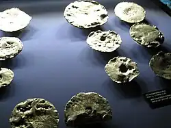 Besides the coins, the majority of individual pieces are accounted for by garment appliques and belt adornments (totaling 600 pieces).[2] Dozens of garment appliques are an extremely unusual find. These are small, silver sequins in various shapes, intended to be sewn onto garments. They were at the height of fashion in the 14th century, but, because they were made of solid silver, when the fashion changed all were melted down. The few surviving examples are almost all part of ecclesiastical textiles owned by churches. Erfurt provides rare evidence of the use of such ornaments in secular clothing.