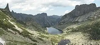 Ergaki Nature Park is a protected area which contains the mountain range.[2] One natural feature of the park is the Hanging Stone, it is a stone which is perched high above Lake Raduzhnoye.[3]