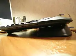 Handheld ergonomic keyboards are designed to be held like a game controller, and can be used as such, instead of laid out flat on top of a table surface. They allow the user the ability to move around a room or to lean back on a chair while also being able to type in front or away from the computer.[21] Some variations of handheld ergonomic keyboards also include a trackball mouse that allow mouse movement and typing included in one handheld device.[22]