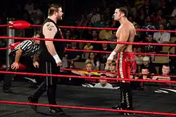 Later that year, in December, Edwards began teaming with fellow Sweet and Sour, Inc member, Davey Richards, as The American Wolves.[7] Their first match as a team was on December 26, at All Star Extravaganza IV, where they lost to The Briscoe Brothers (Jay and Mark) in a three-way elimination tag team match, which also involved Claudio Castagnoli and Nigel McGuinness.[44] The following night at Final Battle 2008, the American Wolves, along with Go Shiozaki, lost to Brent Albright, Roderick Strong, and Erick Stevens in a "New York City Street Fight". Later that night, they attacked and injured Mark Briscoe.[45] As 2009 began, they began challenging for the ROH World Tag Team Championship, losing to the champions Kevin Steen and El Generico on numerous occasions.[46][47] They eventually won the Championship on April 10, at a Ring of Honor Wrestling taping, in a "Tables are Legal" match.[48] Edwards and Richards went on to successfully defend the Championship against teams made up of ROH's top wrestlers including Tyler Black and Bryan Danielson, and against former champions Kevin Steen and El Generico at Manhattan Mayhem III in a submission match.