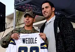Head coach Mike McCoy named Weddle the starting free safety to begin the regular season, along with strong safety Jahleel Addae. He was inactive for two games (Weeks 7–8) after sustaining a groin injury.[56] His injury ended his 86-game streak of consecutive starts that began in 2010. On November 8, 2015, Weddle recorded a season-high 13 combined tackles (nine solo) during a 22–19 loss to the Chicago Bears in Week 9.[57] On December 20, 2015, he made two combined tackles and a pass deflection during a 30–14 victory against the Miami Dolphins in Week 15.[58][59] After the game, Weddle and several other Chargers players returned to the field to sign autographs for the fans, as they were unsure if it would be the team's final time playing in San Diego. Once security asked the remaining fans to leave, Weddle laid down on the Chargers logo in the middle of the field.[60] However, the team would stay in the city the following season.[61]
