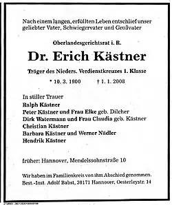 Kästner was also honored by Germany's president for his 75-year marriage to his wife Maria, shortly before her death in 2003 at the age of 102.[3] Both had lived in Hannover since 1945. Some months before his death, he moved to a retirement home in Pulheim near Cologne.[1] Kästner died on 1 January 2008 in the home.[5]