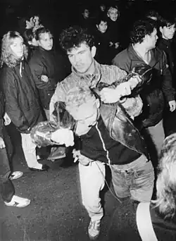 In a 1931 biography written for the Cadre Division of the Comintern,[17] Mielke recalled, "We took care of all kinds of work: terror acts, protecting illegal demonstrations and meetings, arms-trafficking, etc. The last work, which was accomplished by a Comrade and myself, was the Bülowplatz Affair" (German: "Wir erledigten hier alle möglichen Arbeiten, Terrorakte, Schutz illegaler Demonstrationen und Versammlungen, Waffentransport und reinigung usw. Als letzte Arbeit erledigten ein Genosse und ich die Bülowplatzsache.").[18]