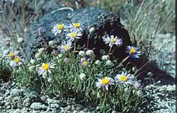 Erigeron elegantulus grows on the rocky volcanic soils of the region. It is a small perennial herb forming patches of narrow, hard, pointed leaves a few centimeters long in shades of green to white. The erect stems are up to 15 centimeters (8 inches) in height and each hold a single flower head less than a centimeter (0.4 inches) wide. The head has a center of yellow disc florets and a fringe of 20-25 ray florets which may be blue, purple, or pink.[2][3]