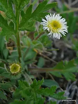 Erigeron pallens is a tiny, unbranching perennial herb rarely more than 10 centimeters (4 inches) tall, producing a woody taproot. The leaves are covered with wool. The plant generally produces only 1 flower head per stem, each head with 50–60 white, pink, or purple ray florets surrounding numerous yellow disc florets. The plant grows on rocky slopes in sparsely vegetated slopes.[2]