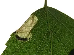 Eggs are laid on the leaf bud and the larvae feed on the leaves in a mine from the end of March to early-May. The mine starts at or near the edge of a leaf and widens into a blotch. The frass is string-like. The larvae have dark markings on the head and prothorax which lighten as it matures.[3][5] Pupation takes place in a tough silken cocoon in the soil.[3]