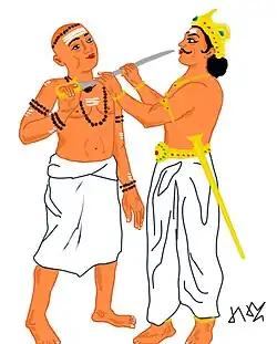 The news of murder of the royal elephant reached Pugal Chola. The enraged king reached the spot of the massacre. While the king expected an army who challenged his authority, he saw a lone crusader standing over the elephant. Upon enquiry, the guards pointed to and introduced Eripatha as the slayer of the elephant. Pugal Chola alighted from his horse and bowed to the angry Eripatha in reverence and asked about the crime of his elephant and men. Eripatha informed him of the events leading to the killing and said that he had punished them for a sin against Shiva. The Chola felt it was his moral responsibility. He bent before the Nayanar and presenting his sword asked the Nayanar to kill him too, as the king is ultimately culpable for the actions of his elephant and army. Eripatha was taken aback by the king's devotion and actions and felt remorseful. He thought it would be best to commit suicide by the sword as penance for the murders. As Eripatha raised the sword to cut his head, the horrified king held his hands to stop him. As they struggled with the sword to sacrifice their lives, Shiva appeared pleased with their devotion and blessed them. He also resurrected the elephant and the king's men. Sivakami Andar's basket was also restored with flowers. Eripatha was given the honour of seating on the royal elephant, while the king held the royal umbrella over his head, like a slave. Both of them went to the Pasupateeswarar temple and worshipped Shiva. After death, Eripatha is said to have attained Kailash, Shiva's abode and became the leader of his ganas (attendants).[3][4]