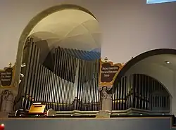 When the church was built, an organ was built on the southern gallery by G. F. Steinmeyer & Co. (Oettingen), with two manuals and 21 stops. It was expanded in 1938 by Albert Moser to 49 stops and electric traction, and an overhaul followed in 1962 by the Kaufbeuren company Orgelbau Schmid.[9] A second organ was built by Rieger Orgelbau on the west gallery in 1990. It has three manuals and pedals with 43 stops.[10]