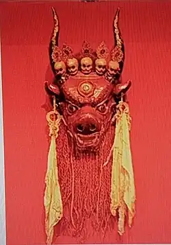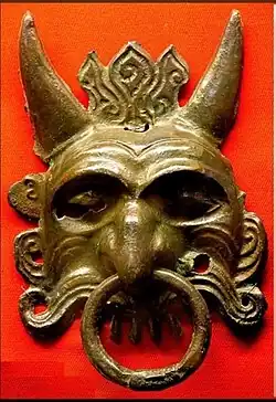 In Turkic mythology, Erlik was the deity of evil, darkness, lord of the lower world and judge of the dead. Erlik is a brother of Ülgen, they both have been created from Kayra (Tengere Kayra Khan).[4] He wants to be equal to Ulgen, he makes his own land and was sent to the prison at the 9th layer of the earth and became opposed to the upper world, the realm of light. According to the Khakas, Erlik resides in the deepest underworld in a palace of copper with furniture made of gold.[5]