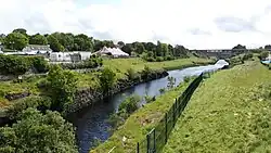 The Erne rises on the east shoulder of Slieve Glah mountain[1] three miles south of Cavan in County Cavan, Republic of Ireland, and flows 80 miles (129 km)[2] through Lough Gowna, Lough Oughter and Upper and Lower Lough Erne, County Fermanagh, Northern Ireland, to the sea at Ballyshannon, County Donegal back in the Republic.[3] The river is 120 kilometres long and is used for fly fishing for trout and salmon, with a number of fisheries along both the river itself and its tributaries. The town of Enniskillen is mostly situated on an island in the river, between Upper and Lower Lough Erne. It is linked to the River Shannon by the Shannon–Erne Waterway.