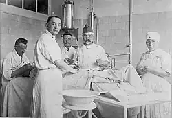 Ernest Broquet in the operating room (pictured in the center in the hat and glasses)