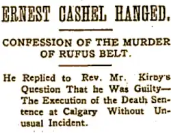 On July 20, 1903, a farmer discovered Belt's decomposing body in a river. Examination showed that he had died from a gunshot to the chest, with the bullet found being the same type and caliber as the rifle Cashel carried. Cashel was brought from Stony Mountain Penitentiary back to Calgary to face murder charges in the death of Belt.[3] The trial began on October 19 and lasted until October 27, at which time Cashel was found guilty and sentenced to hang, the execution date being set for December 15.[4] Because of his history of escaping, he was held in a specially-built cell, which kept him separate from the other inmates, and was itself set in one corner of a large room where it could be seen by everyone within.[6] The gallows where Cashel was to hang was visible outside the window.