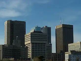 Throughout the 1960s, the City of Winnipeg conducted transport studies which led to a rethinking of traffic flow through Portage Avenue and Main Street, the city's hub, and had Smith Carter conduct the transit forecast studies which concluded that mixing pedestrian and vehicular traffic would no longer be viable, ultimately leading to the construction of an underground concourse replacing the four sidewalks of the corner.[19] Significant or large scale works during this period include the Canadian Wheat Board and Grain Commission buildings (1962 and 1970, respectively), the Royal Bank of Canada and Bank of Canada buildings (1965 and 1971), the Pan Am Pool (1967), and the Manitoba Centennial Centre (1967–1972).[note 2] One of the firm's most identifiable works from the period, and "one of the most identifiable landmarks of the city" is the Richardson Building[9] (1967–1969; with Skidmore, Owings and Merrill as consulting architects),[20] It forms the anchor of the Lombard Place development, which includes the Winnipeg Inn (1970, currently the Fairmont Hotel) and the underground concourse later connected to Trizec's Winnipeg Square shopping mall (1979)[20] and the Commodity Exchange Tower (1974–1979, often referred to as the "Trizec Building" locally).[21] Other large scale projects included the Woodsworth Building on Broadway (1973), The Great-West Life Assurance Company (1983), and the Air Canada building (1985).[6]