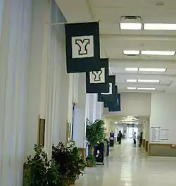 The next concern for Wilkinson was increasing the enrollment of BYU. He instituted a program in which members of BYU faculty would travel with general authorities to stake conferences. They attended nearly 180 conferences, emphasizing the benefits of a BYU education. Enrollment increased by more than twenty-five percent in fall of 1952.[38] After discontinuing the program in 1952, Wilkinson continued to recruit for BYU by sending representatives to high schools and church missions, which received some criticism from mission presidents and was terminated by the First Presidency shortly after.[39] Despite the criticisms, Wilkinson's tactics were successful, and enrollment increased to over 10,000 by the 1956–57 school year.[40] Colleges were reorganized in order to group similar studies together and allow for the most growth and success of students. For example, the College of Arts and Sciences and the College of Applied Sciences were broken into multiple colleges in 1954 including, but not limited to, the College of Biological and Agricultural Sciences and the College of Humanities and Social Sciences.[41] The Department of Physical Education, Health, and Athletics was separated from the College of Education and established as its own college and the College of Education was forced to relinquish its monopoly on the training of teachers and made to be a college specific to teaching methods.[42] Wilkinson improved the salaries of faculty in order to recruit more talented professors and staff members to BYU.[43] The Army and Air Force ROTC program at BYU was established by Wilkinson in 1951 for the Air Force and 1968 for the Army.[44] An engineering program with its own building was established by Wilkinson with the help of Harvey Fletcher, and in 1956, broke into three programs: civil, mechanical, and electrical.[45] Wilkinson also established a College of Family Living in late 1951, alleged to be the first in the United States, however, Purdue University had opened a Department of Family Life in 1946.[46] In order to increase the size and quality of the graduate program at BYU, Wilkinson instituted a policy that encouraged faculty to pursue graduate studies at other universities. Through the policy, the university could obtain faculty qualified to teach graduate students as well as faculty who have attended other universities and thus obtained a more well-balanced education, preventing the "academic inbreeding" that had been a problem at the institution.[47] The number of professors that held doctorates, especially from other universities, increased significantly.[47]