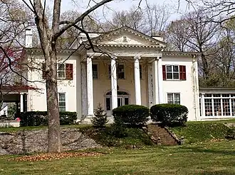 The Ernest R. Burwell House is located on the east side of Bristol's fashionable Federal Hill residential area, at the northeast corner of Grove and Oakland Streets. Although it faces Grove Street, it is set well back, with a tree-dotted lawn and semi-circular drive in between. It is a two-story masonry structure, its exterior finished in stucco. It is covered by a low-pitch hip roof, at whose center is an elevated monitor section. The roof was originally encircled by a low balustrade, which has been removed; a similar balustrade still adorns the garage. The main facade is three bays wide, the central one sheltered by a massive two-story four-column temple portico, with Doric columns rising to an entablature and fully pedimented and dentillated gable. An open porch is set to the left, and a solarium enclosed in glass is to the right. The interior is lavishly finished, with parquet floors in the foyer, a grand curving staircase, and mahogany paneling and bookcases in the library.[2]