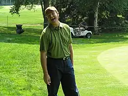 Els surprised the golfing world by winning the 2012 Open Championship in July by birding the 72nd hole. Adam Scott led by four shots after a birdie at the 14th hole, but bogeyed the final four holes to miss a playoff with Els by one stroke.[18] Els's win rejuvenated his career and earned him 5-year exemptions to the other 3 majors.[19] Els became the eighth player to win major tournaments in three different decades, joining his countryman Gary Player, Jack Nicklaus, Lee Trevino, Billy Casper, Raymond Floyd, John Henry Taylor, and Harry Vardon (Tiger Woods and Phil Mickelson have since become the ninth and tenth, respectively).[20] Els's win also marked the third major champion out of the previous four major championships to be won with a type of long putter. His win reignited the controversy over the legality of long or anchored putters in golf.[21]