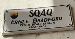 Bradford lived in Kalkara, on Malta for a number of years, this also being where he died, and where a commemorative marble plaque exists to his memory and a street next to his old home is named after him.[9]