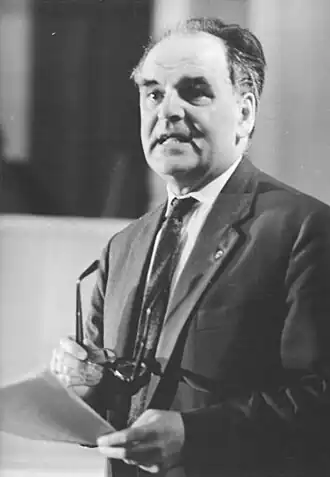 Further appointments at the vital interface between the academic and political worlds followed. In 1960 the (East) German Academy of Sciences appointed him as Director of its Institute for German History in succession to Karl Obermann.[1] From 1969 till his retirement in 1974 he headed up the restructuring of the Academy's so-called "Research Centre for Methodology and then History of History Sciences" ("Forschungsstelle für Methodologie und Geschichte der Geschichtswissenschaft"). During this time he developed and promulgated his "Education Theory" ("Formationstheorie").[13] Between 1960 and 1980 Ernst Engelberg served as President of the National Committee of East German Historians ("Nationalkomitee der Historiker der DDR").[1]