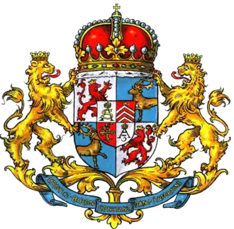 In 1730, Anna was elevated to the Russian throne. Biron and his wife moved to Moscow, both of them retaining their position as adviser and lady-in-waiting, and received many honours and riches. At Anna's coronation (19 May 1730), Biron was appointed grand chamberlain, made a count of the Empire, and granted an estate at Wenden with an income of 50,000 crowns a year.[3] It was on this occasion that his name was first rendered in court documents as 'Biron' (rather than 'Biren'), and he is said to have adopted the arms of the French Ducal House of Biron, to which house he did not in fact have the slightest connection.