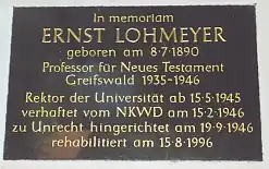 Lohmeyer opposed the Nazis and all related fascist impulses within the German church and society from their onset in the early 1930s.[1] He demonstrated his friendship and solidarity with Jewish professors Martin Buber and Jonas Cohn, in an era of strong antisemitism. Lohmeyer wrote to Martin Buber in 1933 that "the Christian faith is only Christian as long as it retains in its heart the Jewish faith".[n 1] In this period, his Evangelical Church of the old-Prussian Union, like other Protestant churches, was very quiet on the Jewish question. Gerhard Kittel even attacked Buber. On October 15, 1935, he was demoted from a professorship in prestigious Breslau to the relative backwater of Greifswald for his opposition to the Nazis.