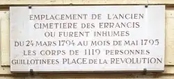 The cemetery was used for the bodies of victims of the guillotine after the Madeleine Cemetery was closed. It was used for this purpose between March 25, 1793, until the end of May 1795. The memorial plaque, located on Rue de Monceau between number 97 and the corner with Rue de Rocher, states that 1,119 victims of the guillotine were buried here.