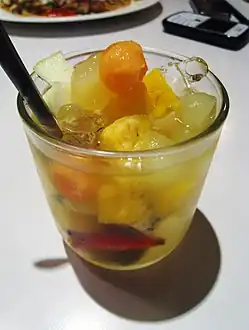 Sop Buah (also known as Es Buah) is an Indonesian iced fruit cocktail dessert. This cold and sweet beverage is made of diced fruits, such as honeydew, cantaloupe, pineapple, papaya, squash, jackfruit and kolang kaling (Arenga pinnata fruit), mixed with shaved ice or ice cubes, and sweetened with liquid sugar or syrup. The type of fruit used in this dessert may vary, some might add any available fruits such as mango, watermelon or longan — some imported fruits — such as lychee, kiwi, strawberry, pear, peach or grapes. Other ingredients might be added too, such as agar-agar jelly, grass jelly, seaweed or nata de coco.
