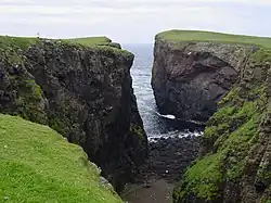 Esha Ness is on the west coast of Northmavine on the island of Mainland, Shetland. It lies to the northwest of St Magnus Bay, to the north of Papa Stour.[2] There are several small settlements in the peninsula, including Stenness and Tangwick in the south, Braewick and Braehoulland in the east, and Ure near the north coast. The principal road running through the peninsula is the B9078 road which passes near Braewick and West Heogaland to the coast, ending at Stenness.[3] Calder's Geo is a large geo that cuts into the western black volcanic cliffs of Esha Ness. To the north of the geo is a sea cave that has been measured at more than one and a half times the size of "Frozen Deep", a chamber in Reservoir Hole under Cheddar Gorge in Somerset, potentially making it the largest natural chamber in Britain.[4]