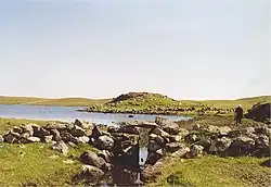Cross Kirk Cemetery lies near the Loch of Breckon, with the graves of physician John Williamson (Johnnie Notions), with a stone of mixed Roman and Runic inscriptions, and the grave of Donald Robertson with epitaphs. Sae Breck Broch, partially excavated by Charles S. T. Calder in 1949, is about 200 metres (660 ft) up a steep hill to the west of the cemetery, and contains the remains of a coast guard watchtower. About 1 kilometre (0.62 mi) directly east of here is the site of Hogaland Broch. The Broch of Houlland is on a large promontory on the Loch of Houlland, which has three rows of defensive walls. Also of note is March Cairn, a Neolithic square cairn overlooking Muckla Water. Excavated by Calder in 1949, it is 10 metres (33 ft) across and contains a cruciform chamber of about 1 metre (3 ft 3 in) in height, supported by large stones. Two pottery sherds, two stone discs and a quartz tool were unearthed at the site. Muckla Water square cairn is about 250 metres (820 ft) east-northeast of the site.[9]