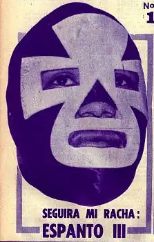 In 1958 or 1959 José Eusebio had begun working as "El Espanto" ("The Terror") and a short time after José Eusebio's best friend Fernando Cisneros Carrillo adopted the character Espanto II, becoming a regular tag team known as Los Espantos.[3] By November 1962 both Espanto I and Espanto II had lost their masks in Lucha de Apuestas, or bet matches.[3] At this point Miguel Vázquez donned the distinctive black and white mask of Los Espantos and became Espanto III. With the addition of Espanto III Los Espantos' became a regular trio, and one of the first to work as an "identical trio" by using the same name with only numbers to distinguish themselves, a tradition that still exists in lucha libre.[4] Initially he mainly supported Espanto I and II as they fought against rivals El Santo and Rubén Juárez respectively, serving as their corner man during Lucha de Apuestas, or "bet matches".[3][5] Not long after his debut as Espanto III, he won his first Lucha de Apuestas, defeating Javier Escobedo on a show in Guadalajara, Jalisco, forcing Escobedo to be shaved bald.[3]