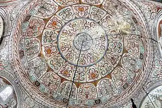 The Et'hem Bey Mosque is composed of a prayer hall, a portico that surrounds its north and the minaret. On the north side is the entrance to the prayer hall, which is a squared plan and is constructed in a unique volume. It is covered with a dome and the dome is semi-spherical and has no windows. The frescoes of the mosque depict trees, waterfalls and bridges. In the interior part of the mosque, on the eastern side of the prayer hall and in the prayer area of women, Süleymaniye Mosque is shown among other landscapes, with its four minarets, same as it appears in the Bachelors' Mosque in Berat. Most of the scenes that appear in mural paintings, are not realistic paintings, but imaginary scenes. The portico of the mosque is decorated by numerous landscapes as well.[8]